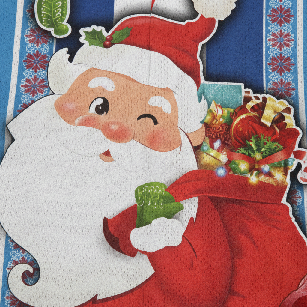 Front Print: Features a large, cheerful Santa Claus carrying a sack of gifts and the phrase "Merry Christmas", adding a fun, seasonal touch.