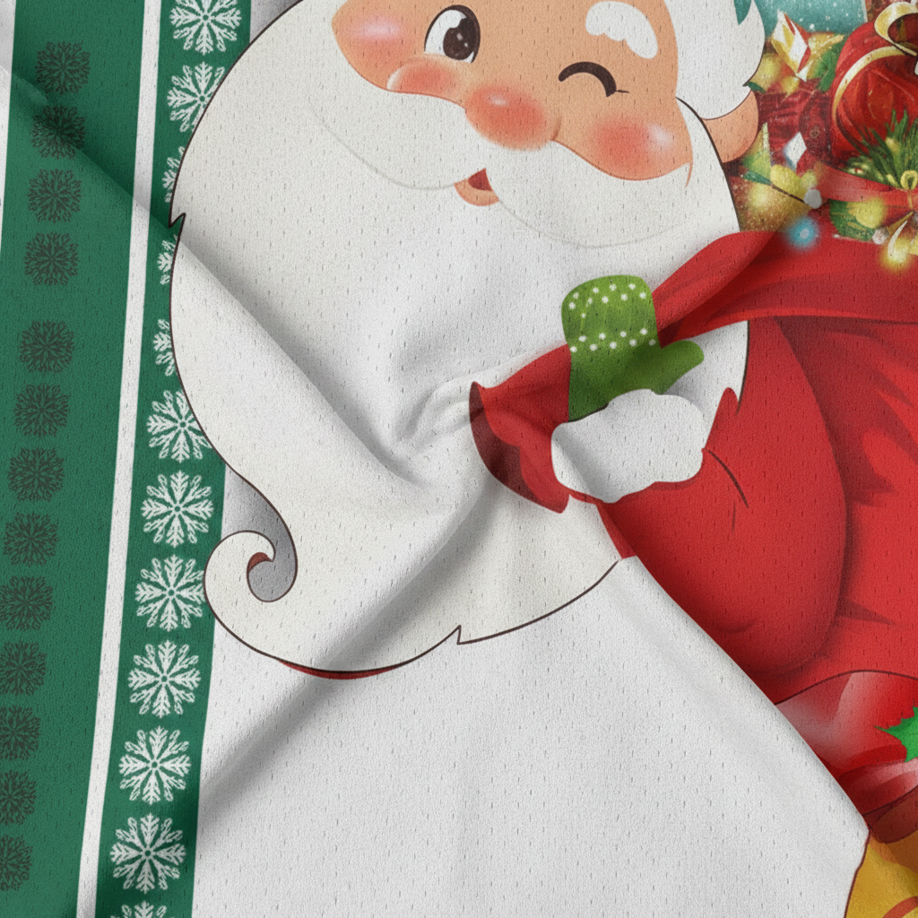 Front Print: Features a large, cheerful Santa Claus carrying a sack of gifts, holly, and the phrase "Merry Christmas" in bold lettering.